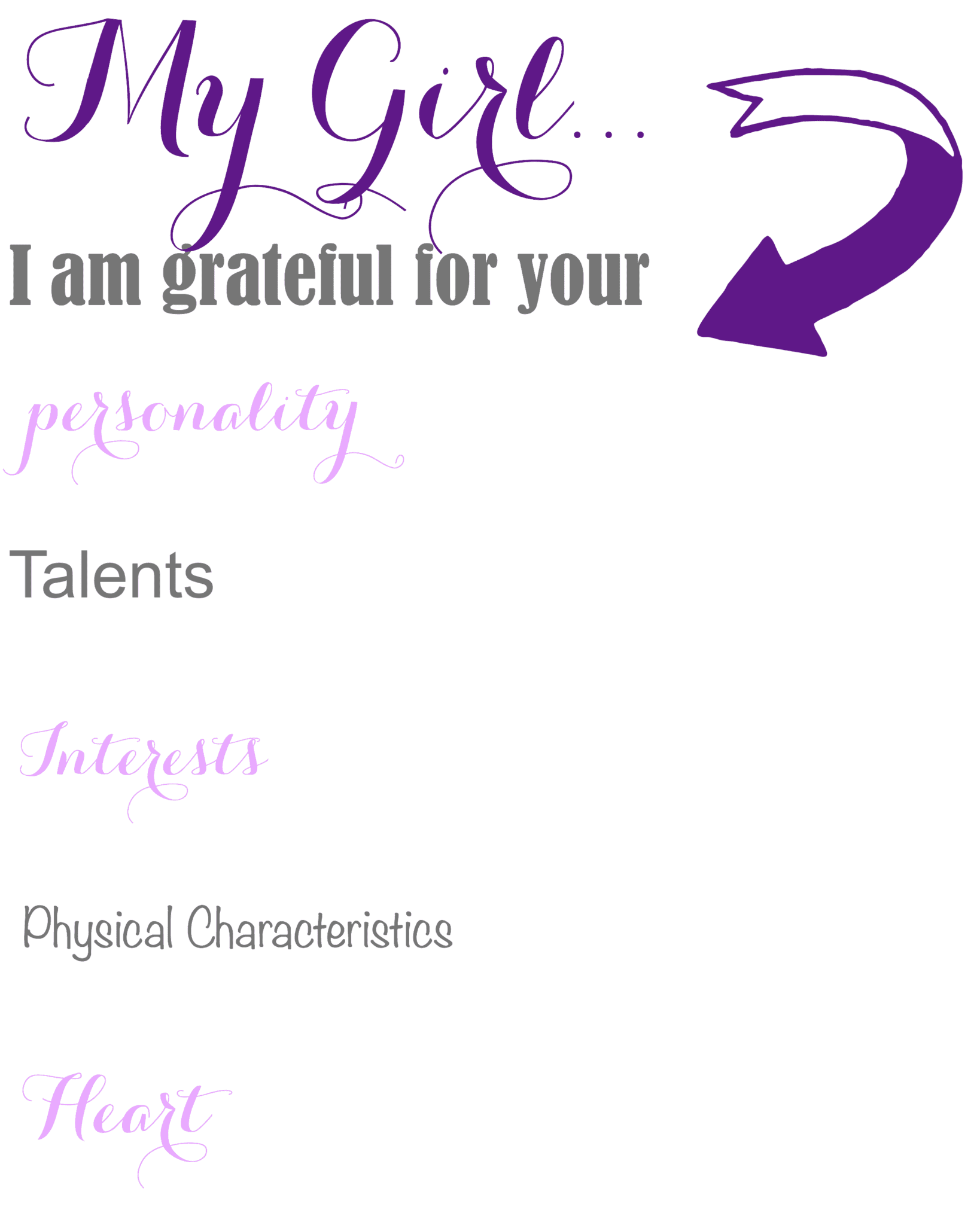 We see our daughters through the special lens of parental love. Even in moments when we are at odds, we believe our daughters have special qualities that make them unique. Often we know why we love our girl, but we forget to tell her. Or we assume she already knows. Here is a very simple document that will take about 3 minutes to fill out reminding your daughter what you see in her that makes her especially beautiful and unique in your eyes.